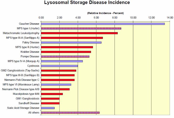 Figure 1. The relative incidences of lysosomal storage diseases are shown based on diagnosed cases in the Australian population. The relative incident rate is the number of patients diagnosed with one disease divided by the total number of patients diagnosed with LSD. Those diseases having major CNS involvement are shown in red. Categories with only low levels of CNS involvement or none are shown in blue. Categories with a mix of disease states with CNS involvement are shown with diamond pattern. Incidence rates were calculated based on the incidence in Australia (Meikle 1999 )