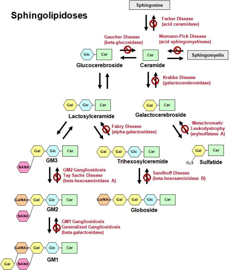 Figure 2. Sphingolipidoses are group of diseases which are caused by an enzyme deficiency and result in the lysosomal storage of lipids. These sphingolipids share a common sphingosine backbone. The disease name is shown adjacent to limiting pathway. The deficient enzyme is shown in parentheses below the disease name. Abbreviations used: Cer, ceramide; Glc, glucose; Gal, galactose; NANA, N-acetyl-neuraminic acid; GalNAc, N-acetylgalacactosamine; GM, ganglioside molecule.